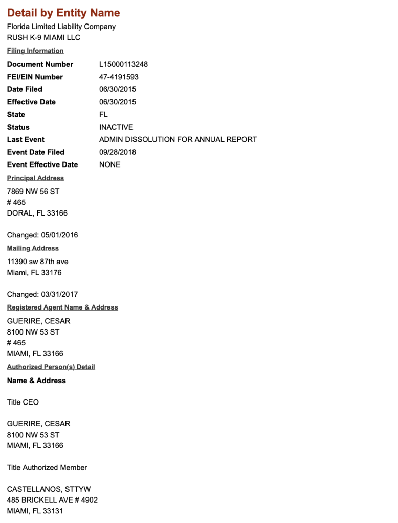Esa dirección la ha utilizado la compañía Rush K-9 Miami LLC en la cual figuraba Alejandro Castellanos como gerente junto a César Augusto Guerire.