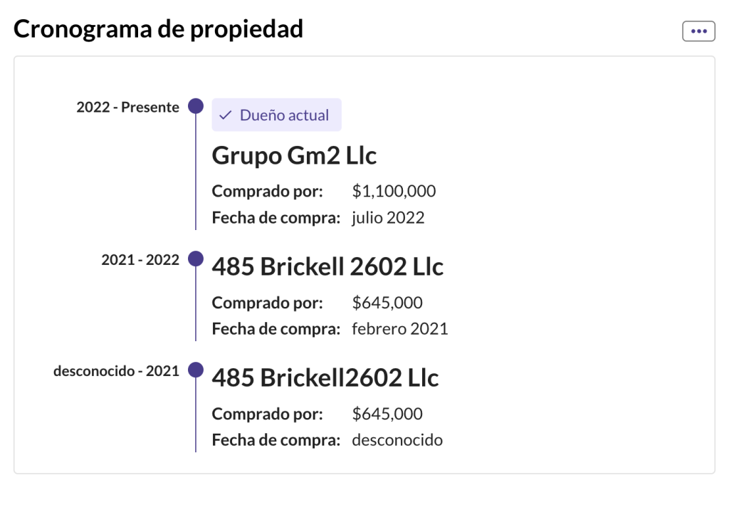 El edificio llamado Icon Brickell III fue construido en 2009 y el apartamento ha tenido como dueños a la siguiente compañías: Brickell2602 Llc y Grupo Gm2 Llc ambas con sede en Miami.