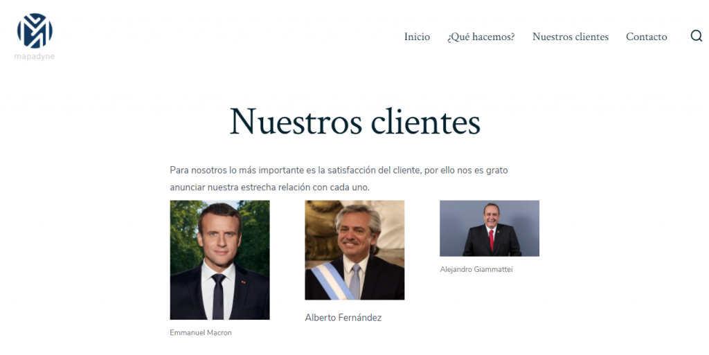 Sin embargo, es uno de los propietarios de Mapadyne Tech, que se define como la mejor empresa de tecnología y comunicación especializada en estrategia para campañas digitales y gobierno digital. En su página web resaltan que entre sus clientes se encuentran: los presidentes de Guatemala, Alejandro Giammatttei; de Argentina, Alberto Fernández y de Francia, Emmanuel Macron. También del exmandatario de Bolivia, Evo Morales y del exalcalde de Bogotá, Colombia, Gustavo Petro.
