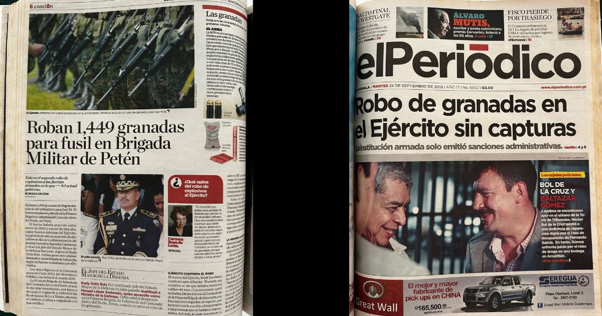 El 23 de septiembre de 2013, elPeriódico evidenció que en marzo de ese año fueron robadas 1,449 granadas para fusil en la brigada militar ubicada en el departamento de Petén. Dicha base estaba a cargo de los generales Juventino Saavedra Carrascosa y Rudy Israel Ortíz Ruíz.