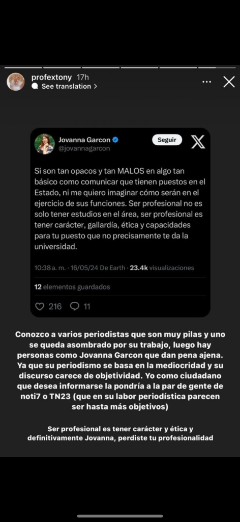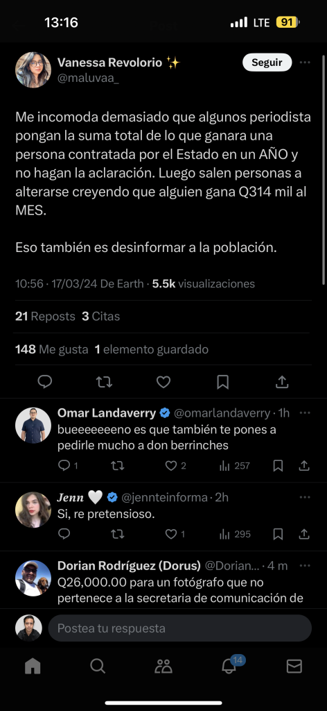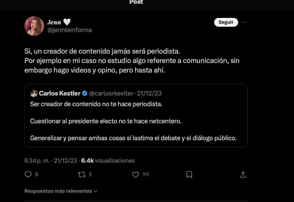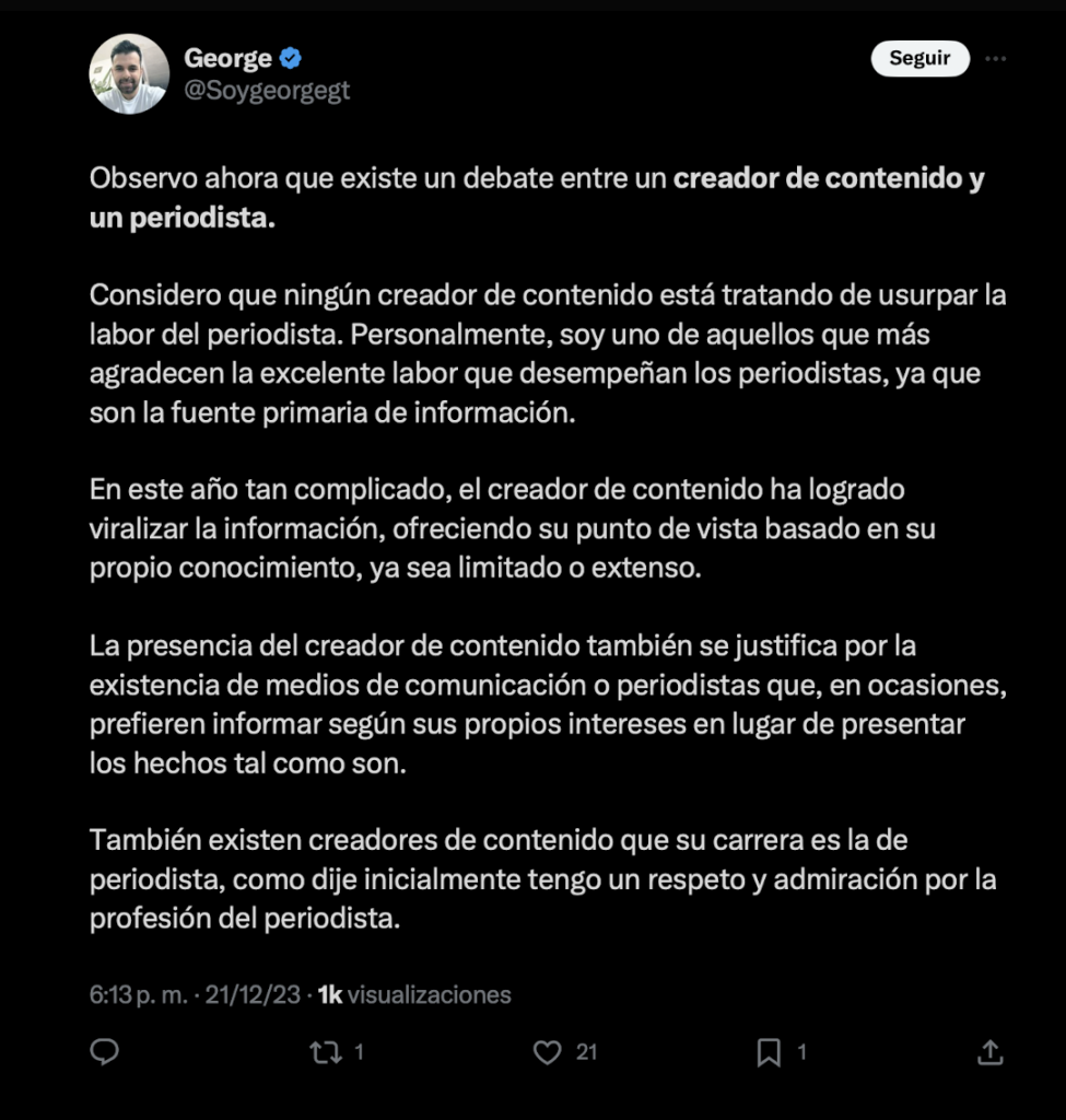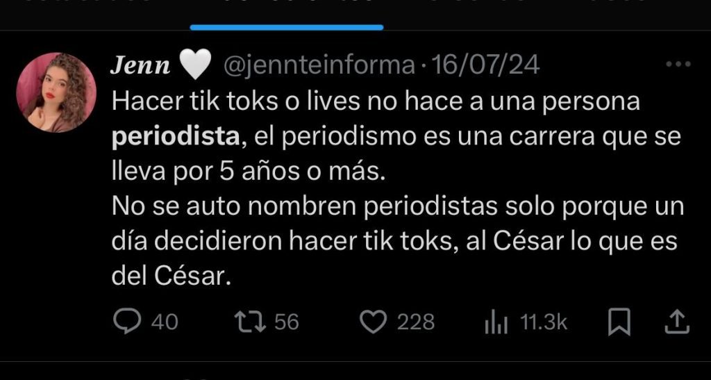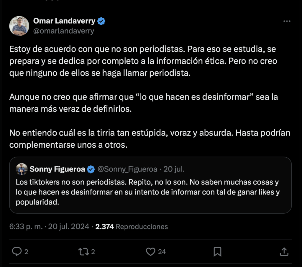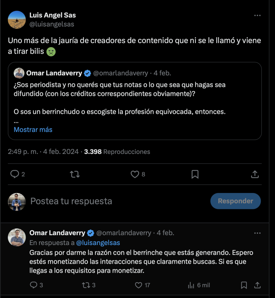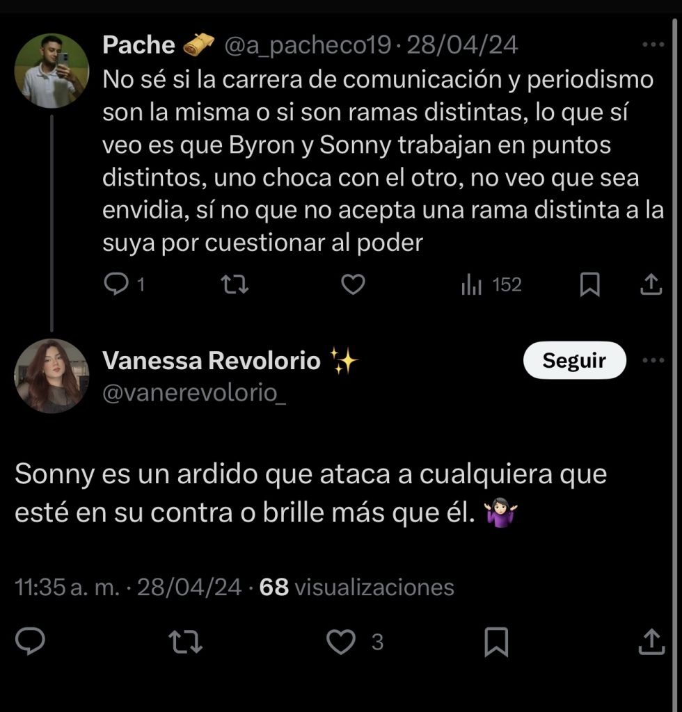 Estos creadores de contenido han realizado publicaciones que posteriormente borran y hacen para descalificar el trabajo de periodistas. También comparten e interactuan con cuentas que insultan, por ejemplo, el usuario de X @ElNeriTuiteador insultó a Sonny Figueroa por lo que se decidió ocultar sus respuestas para no darle visibilidad desde este medio de comunicación.