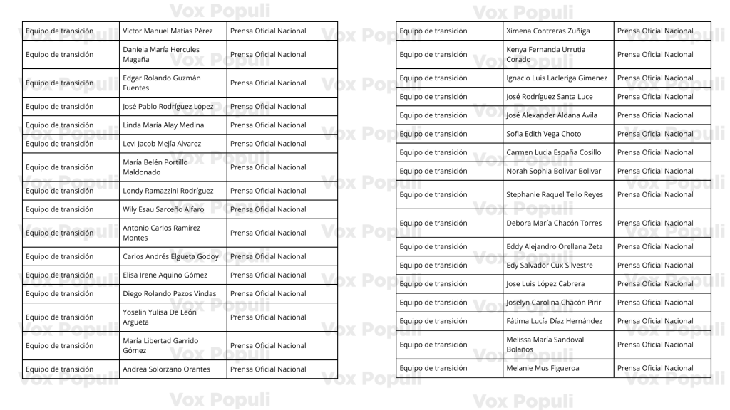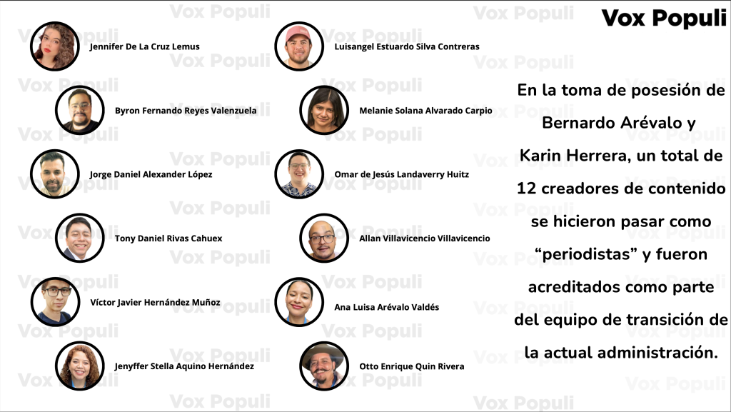 Lista de quienes se hicieron pasar como periodistas: Fátima Lucía Díaz Hernández, Andrea Solorzano Orantes y Melanie Mus Figueroa, asesoras de la diputada oficialista Andrea Villagrán. Stephanie Raquel Tello Reyes, asistente de la diputada oficialista Laura Marroquín. Norah Sophia Bolivar Bolivar, secretaria del diputado oficialista Ronald Ochaeta.