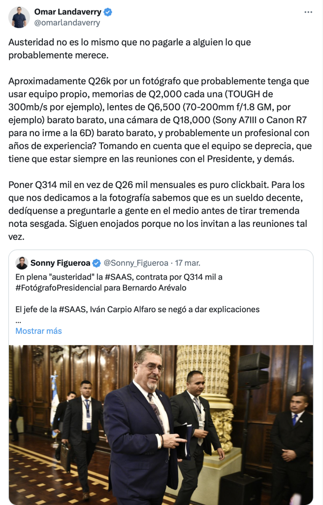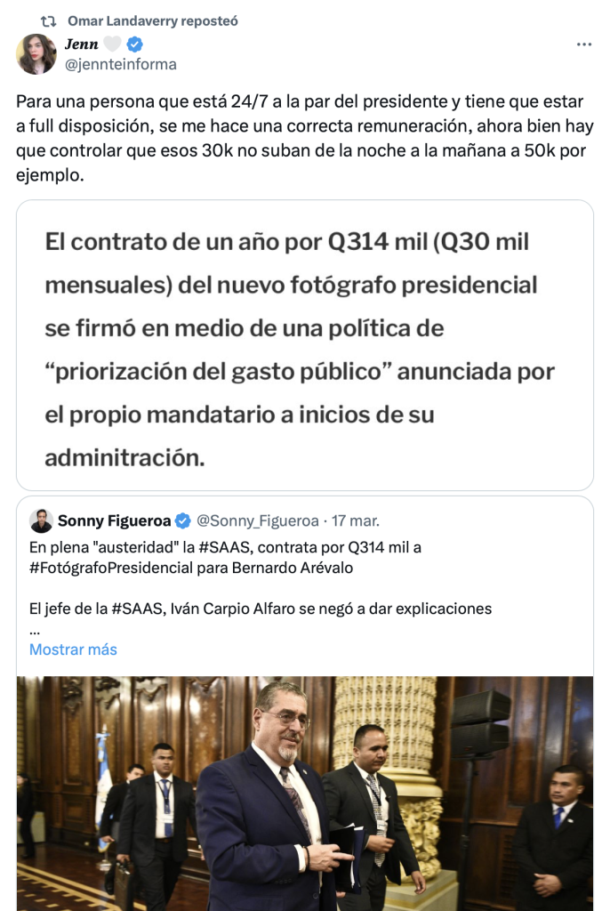 Por ejemplo, en marzo pasado se coludieron en defensa de Daniel Fernando de Jesús Hernández Salazar, a quien la Secretaría de Asuntos Administrativos y de Seguridad de la Presidencia (SAAS) contrató por Q30 mil mensuales como el fotógrafo exclusivo de Bernardo Arévalo, contraviniendo lo expresado días antes por el propio mandatario en el sentido de que en su gobierno “habría austeridad”.