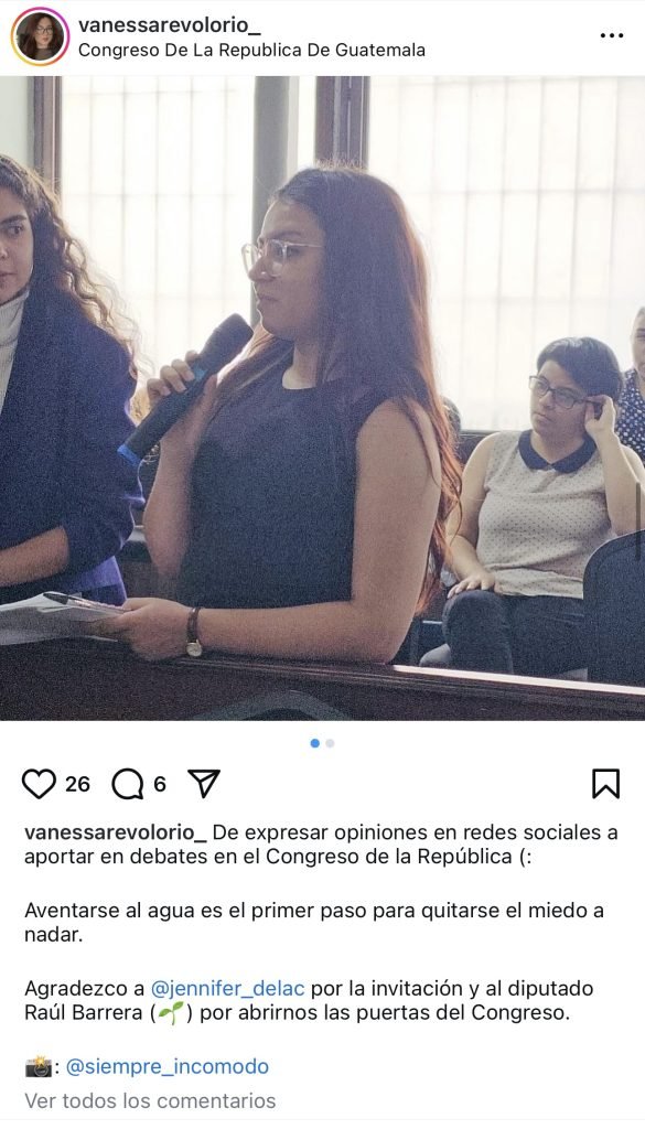 Por ejemplo, también trasladan contenido de Vanessa Revolorio, quien es afin al partido oficial (tiene fotografías con varios integrantes de dicha agrupación) con quien algunos creadores de contenido han realizado actividades en el Congreso de la República. Ella trabaja actualmente en el Ministerio de Trabajo y Previsión Social (Mintrab) cobrando Q7 mil 500 mensuales.