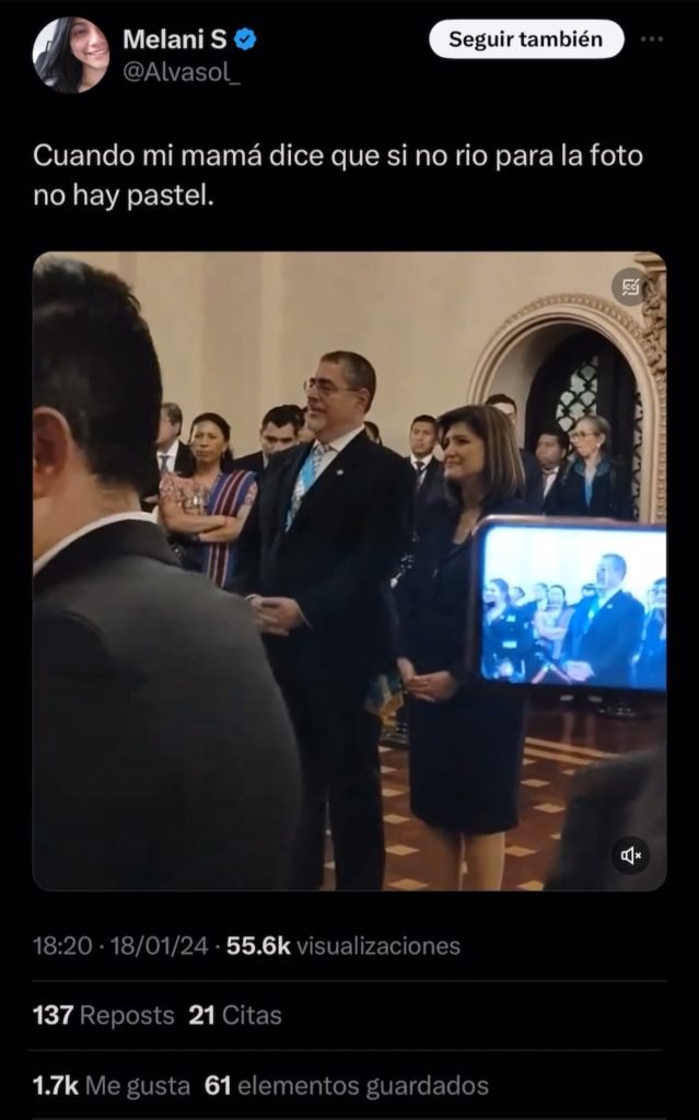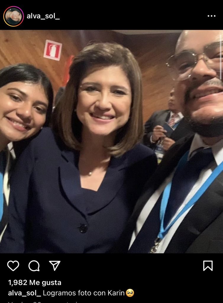 Reyes Valenzuela (@siempreincomodo) y Alvarado Carpio (@alvasol) subieron fotografías a sus redes sociales en las que aparecen junto a la vicepresidenta Karin Herrera. Melanie Solona publicó imágenes en el Salón de Banquetes, del Palacio Nacional de la Cultura. Desde ese lugar, el presidente Bernardo Arévalo dio su primer discurso a la población.