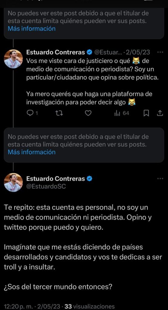 Segunda respuesta de Estuardo Contreras: «No tengo ningún tipo de cercanía con esos inútiles (en referencia al partido Movimiento Semilla). Apoyé al MLP (Movimiento para la Liberación de los Pueblos) en primera vuelta electoral, a Semilla en la segunda. No apoyé en ningún término al proyecto político de Semilla, exigí como ciudadano que se respetaran los mandatos constitucionales y de traspaso de poder«.