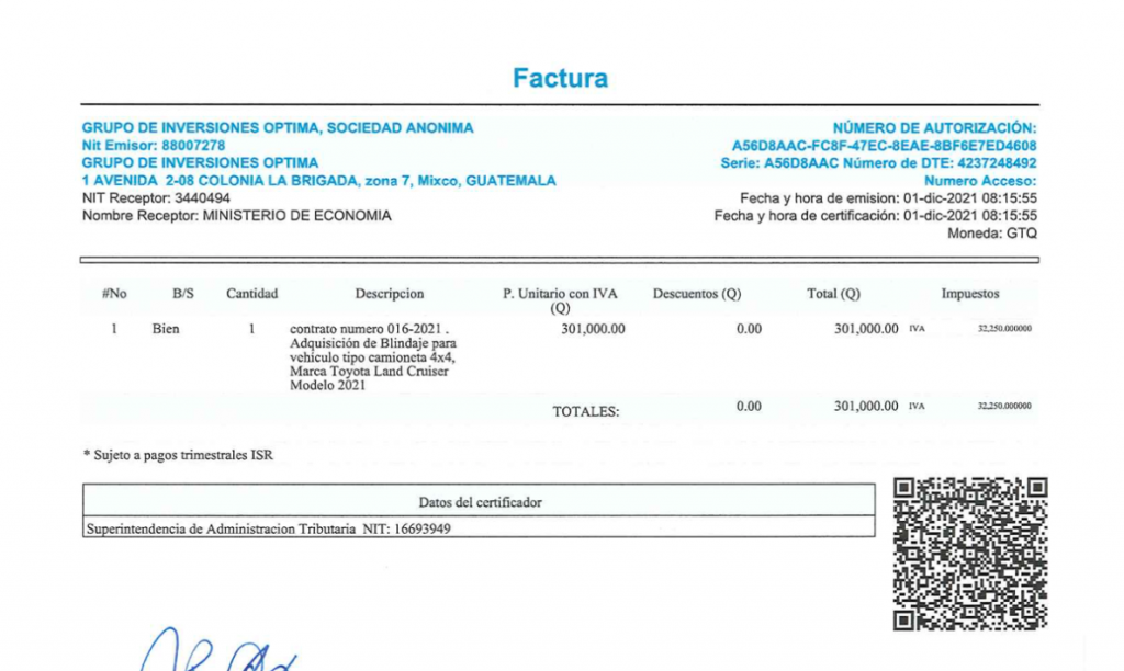 Según los documentos, el Ministerio de Economía pagó a la empresa Grupo de inversiones Optima, Sociedad Anónima un total de Q301 mil por el blindaje nivel 4 de la camioneta Land Cruiser. En total, para la compra y las mejoras del vehículo, el Estado erogó Q970 mil 124.