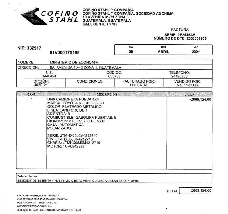 A inicios de año, el Ministerio de Economía compró una camioneta Land Cruiser modelo 2021 por un precio de Q669 mil 124. La publicación del evento se hizo en Guatecompras el 9 de enero y se adjudicó el 23 de febrero a Cofiño Stahl, empresa favorita del Estado para abastecerse de vehículos.
