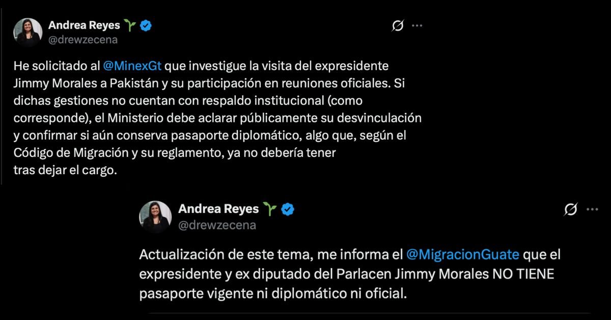 Minutos más tarde, ese día la congresista publicó que en el IMG le informaron “que el expresidente y ex diputado del Parlacen Jimmy Morales no tiene pasaporte vigente, ni diplomático ni oficial”.