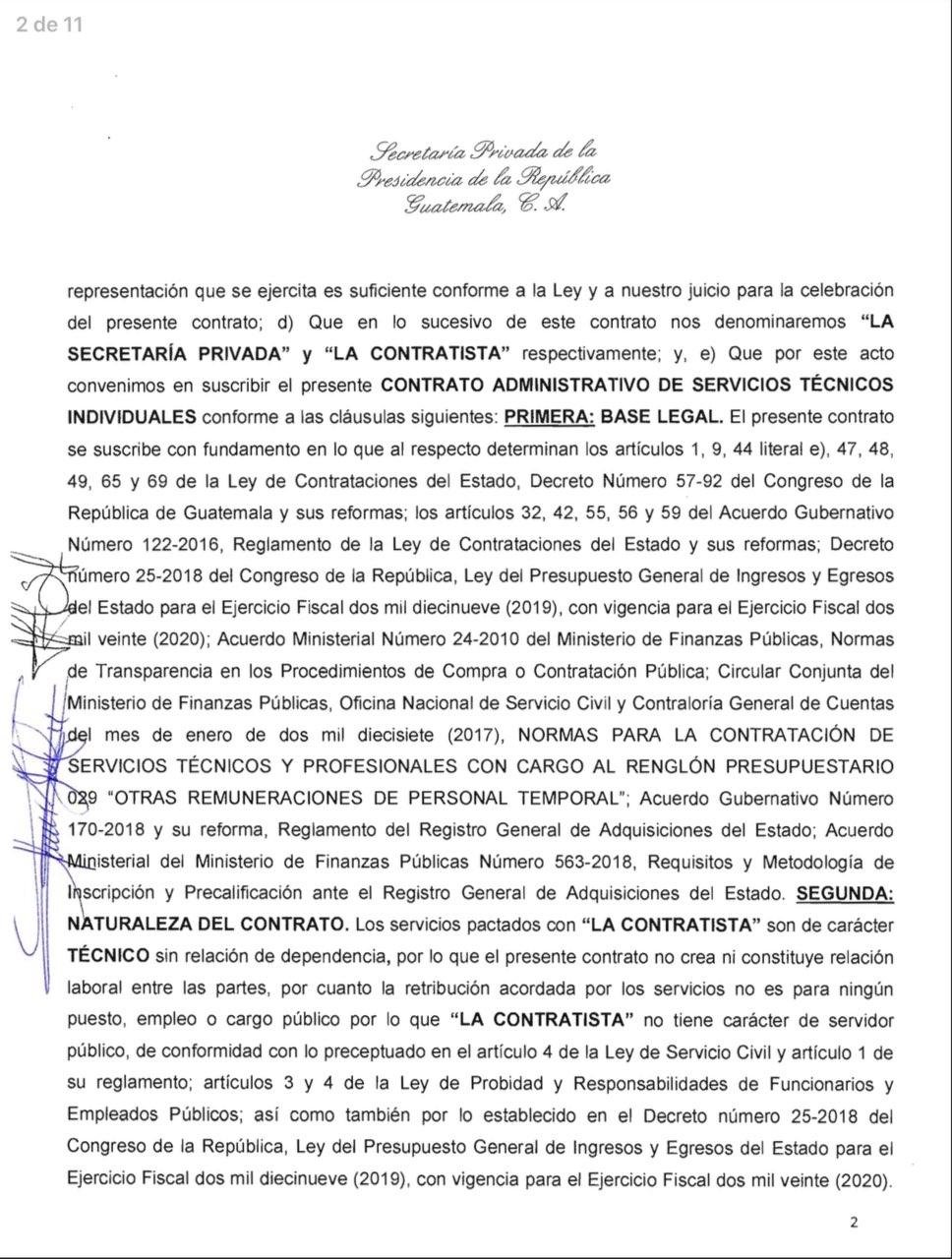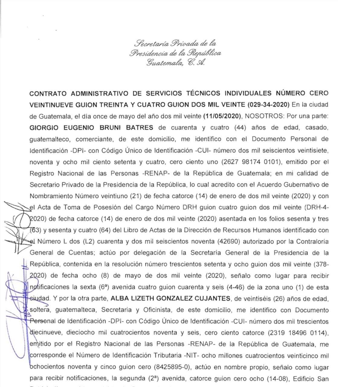 En el contrato firmado el 11 de mayo entre el Secretario Privado de la Presidencia, Giorgio Bruni, de 44 años, y Alba Lizeth González Cujantes, de 26 años, se establece que será contratada bajo el renglón 029 para brindar sus servicios técnicos individuales, ya que únicamente posee el título de secretaria y oficinista. Ella cobrará al mes Q16,500.