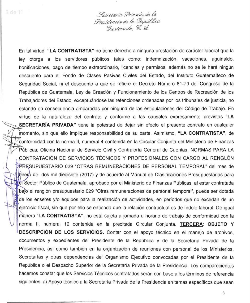 “La única que cumplen las funciones de asesoría en la Secretaría Privada de la Presidencial es la licencia María Consuelo Ramírez Scaglia”, dice parte del documento. Agregan: “Adicionalmente se informa a la presente fecha no hay personas contratadas con actividades de asesoría en el renglón presupuestario 029, 022 y 031”.