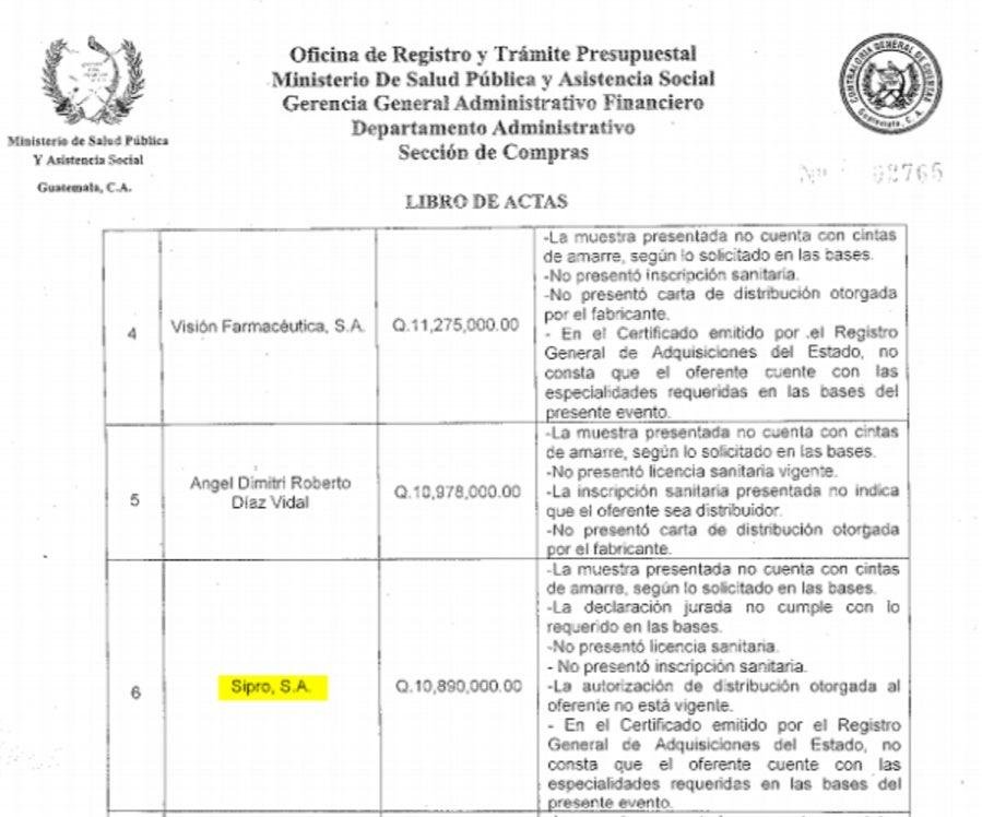 Esta oferta fue rechazada un día después de que el Área de Salud de Escuintla le adjudicara a Sipro, S.A. un contrato por más de Q2 millones a pesar de no contar con licencia sanitaria.