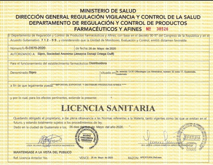 Leslie Lorena Samayoa Jerez, jefa del Departamento de Regulación y Control de Productos Farmacéuticos y Afines, confirmó que Sipro, S.A. obtuvo su registro sanitario hasta el 26 de mayo. Samayoa Jerez, resaltó que el Ministerio no otorga licencias temporales y que una empresa no puede vender insumos médicos sin ese documento.
